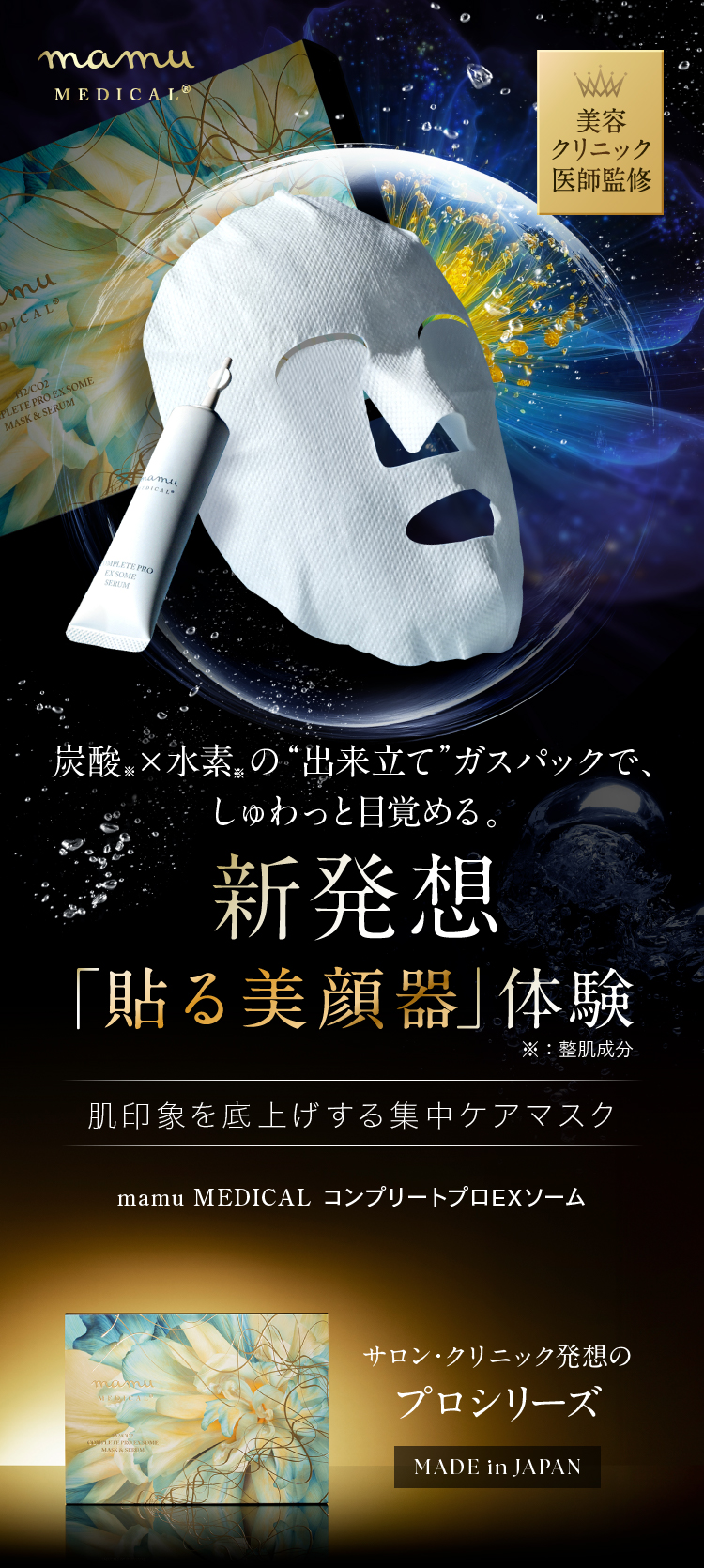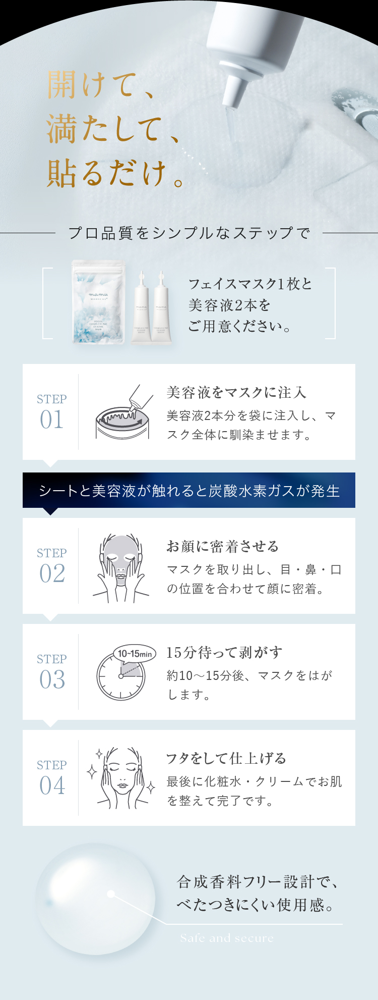 ※美容液を入れた時点で水素と炭酸が発生し始めますので、フェイスマスクに美容液を浸透させたら、手早くお顔に密着させてください。