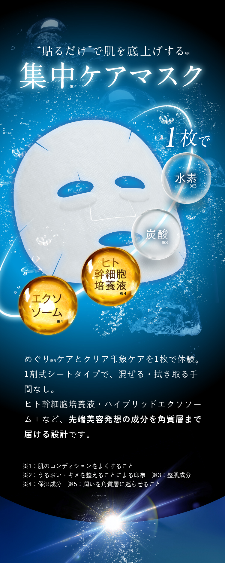 ●お肌に異常が生じていないかよく注意してご使用ください。●傷やはれもの、しっしん等、異常のある部位へのご使用はお止めください。●ご使用中やご使用後または直射日光に当たって、赤み、はれ、かゆみ、刺激、色抜け(白斑等)や黒ずみ等の異常があらわれた場合はご使用を中止し、皮膚科専門医等にご相談ください。そのままご使用を続けますと、症状が悪化することがあります。●目に入った場合はこすらずにすぐに水かぬるま湯で洗い流してください。●万一咳き込んだ場合は、すぐにご使用をお止めください。 ●乳幼児の手の届かない場所に保管してください。●高温多湿、低温、直射日光の当たる場所に保管しないでください。●シートマスクに強い衝撃を与えないでください。成分がこぼれ落ちる可能性があります。●水分に反応して水素と炭酸が発生しますので、開封後はすぐに使用し、再使用はしないでください。●美容液は使い切りです。開封後はすぐに使用し、再使用はしないでください。●使用後は地方自治体の区分に従って廃棄してください。