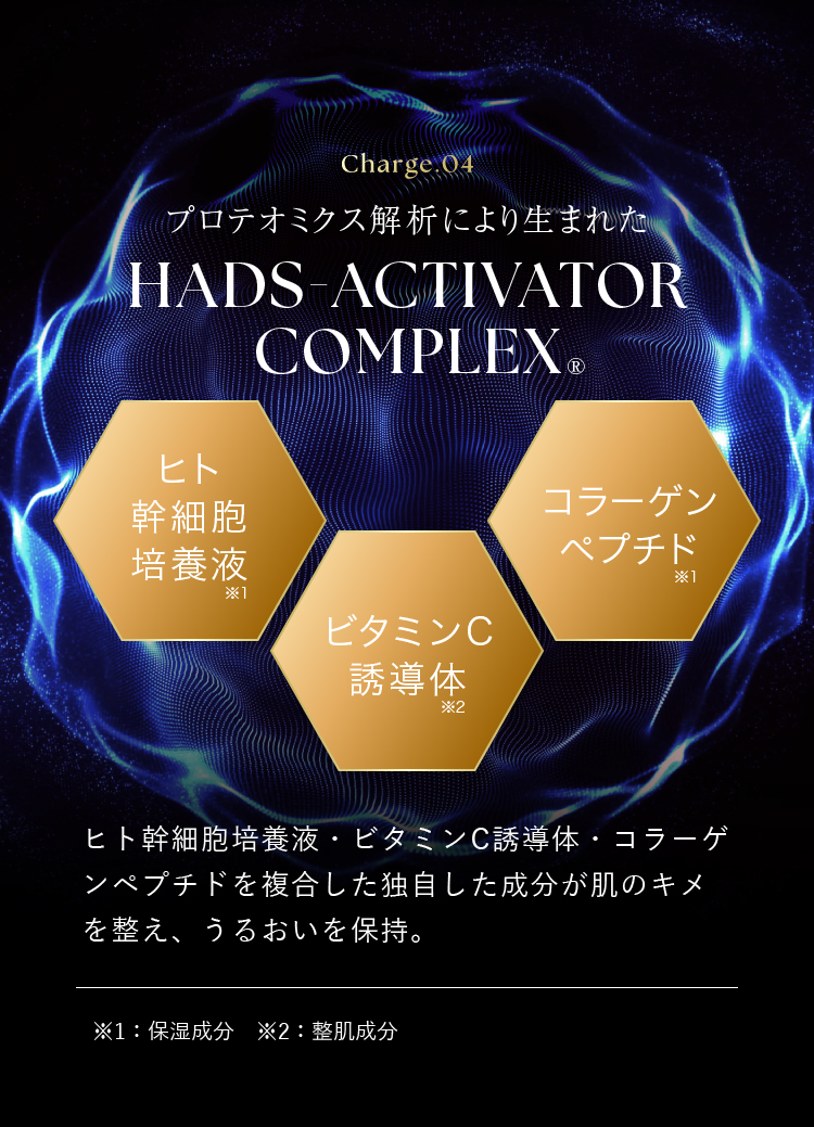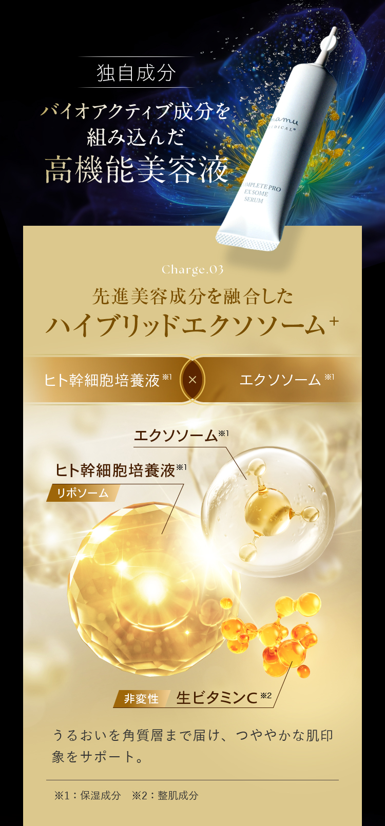 【成分】水、BG、グリセリン、メチルグルセス-10、1,2-ヘキサンジオール、ヒト幹細胞順化培養液、ヒト脂肪由来間葉系細胞エクソソーム、アスコルビン酸、ナイアシンアミド、セラミドNP、セラミドAP、セラミドEOP、ヒアルロン酸アスコルビルプロピル、パルミトイルジペプチド-18、フィトスフィンゴシン、合成ヒト遺伝子組換オリゴペプチド-1、合成ヒト遺伝子組換オリゴペプチド-2、合成ヒト遺伝子組換ポリペプチド-10、合成ヒト遺伝子組換ポリペプチド-11、合成ヒト遺伝子組換ポリペプチド-60、合成ト遺伝子組換ポリペプチド-9、規定化細胞培地9.ヒアルロン酸Na、加水分解ヒアルロン酸Na、アセチルヒアルロン酸Na、エチルヘキシルグリセリン、グリセリルグルコシド、パルミチン酸アスコルビルリン酸3Na、ヒアルロン酸クロスポリマー -2-Na、ステアリン酸、カプリリルグリコール、レシチン、水添レシチン、酢酸トコフェロール、カルボマー、リン酸Na、ペンチレングリコール、ラウレス-4.ポリソルベート80、ラウロイルラクチレートNa、キサンタンガム、コレステロール、カプリロイルジペプチド-17、トリ(カプリル酸/カプリン酸)グリセリル、フェノキシエタノール